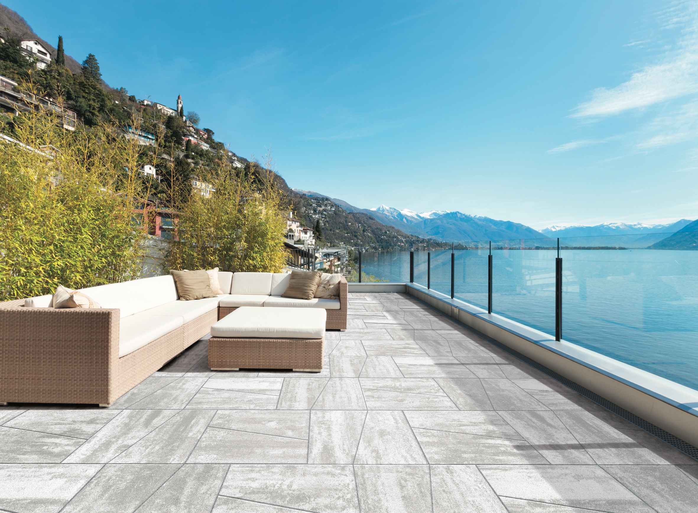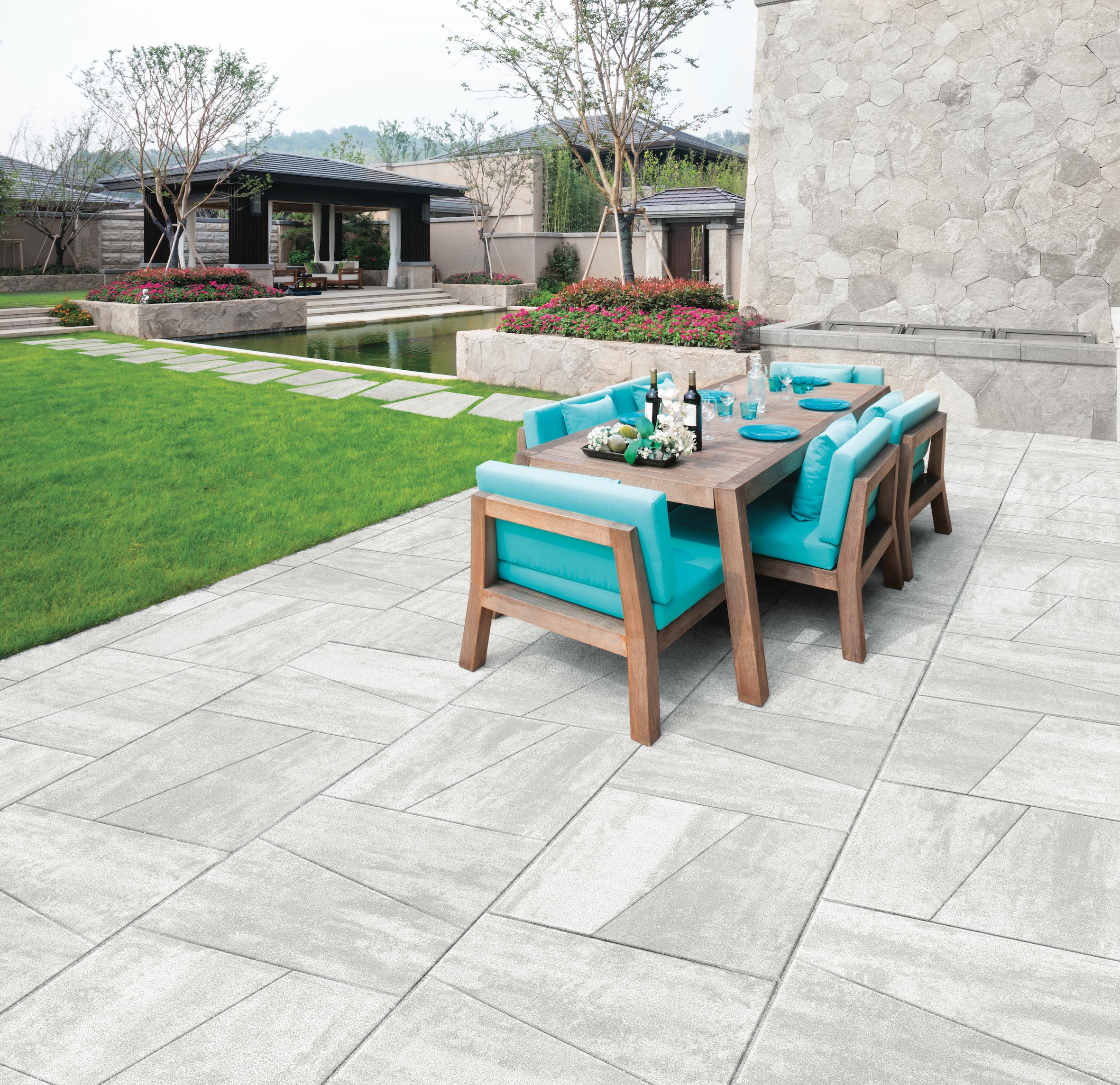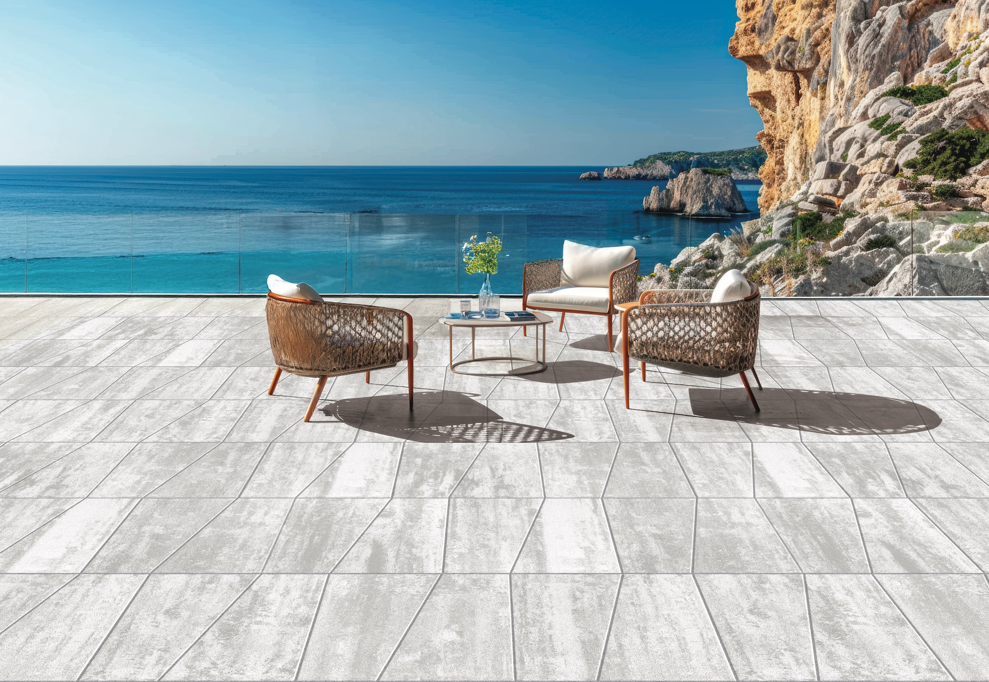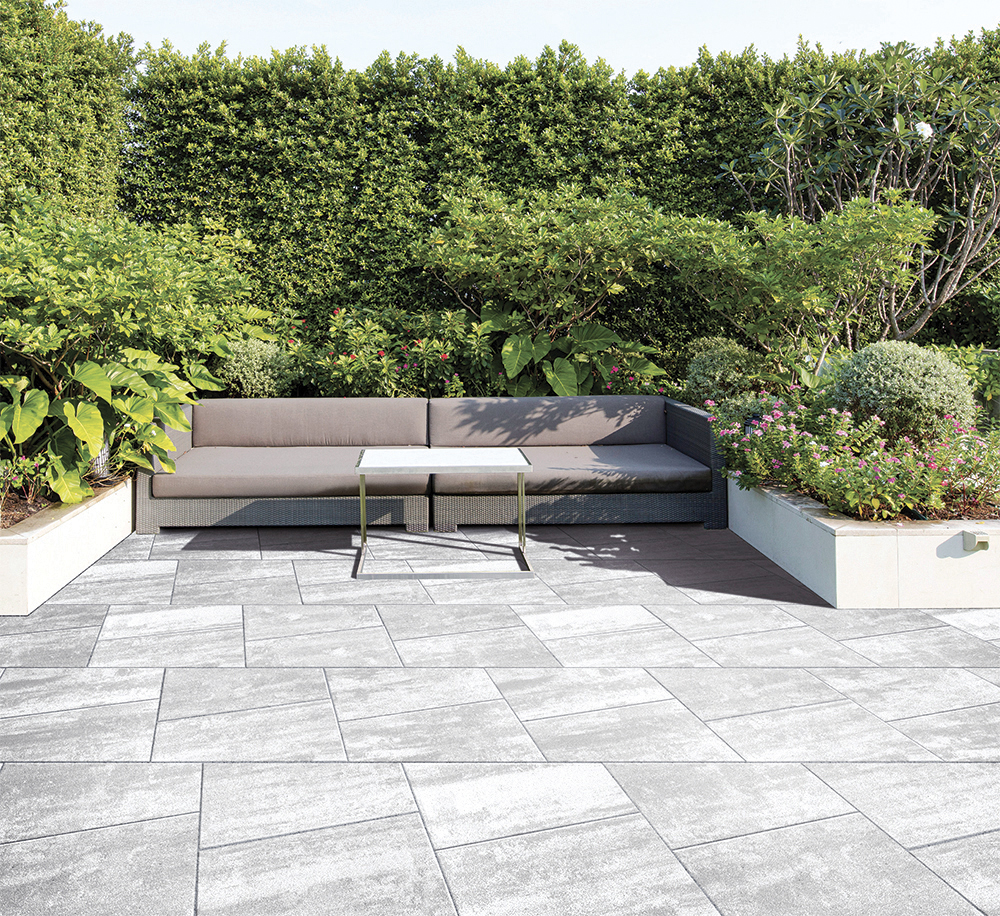Lastra trapezoidale fiammata in pietra ricostruita. Un singolo modulo brevettato che permette varie modalità di abbinamento e di resa del disegno della pavimentazione. D-Vision è la lastra fiammata di spessore 4cm e superficie liscia che grazie al suo Design Unico permette fino a 7 diversi schemi di posa in grado di creare uno spazio esterno moderno e accattivante.