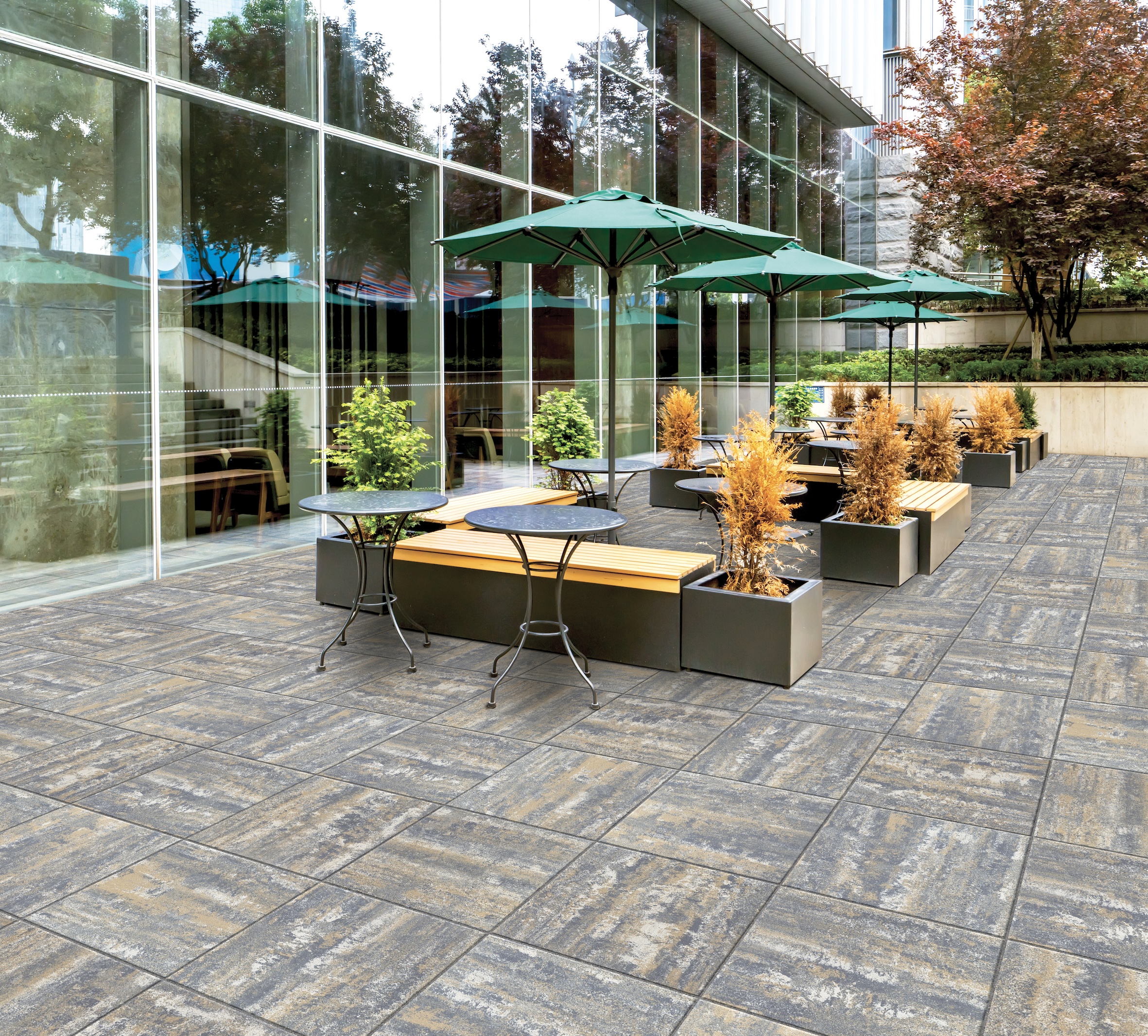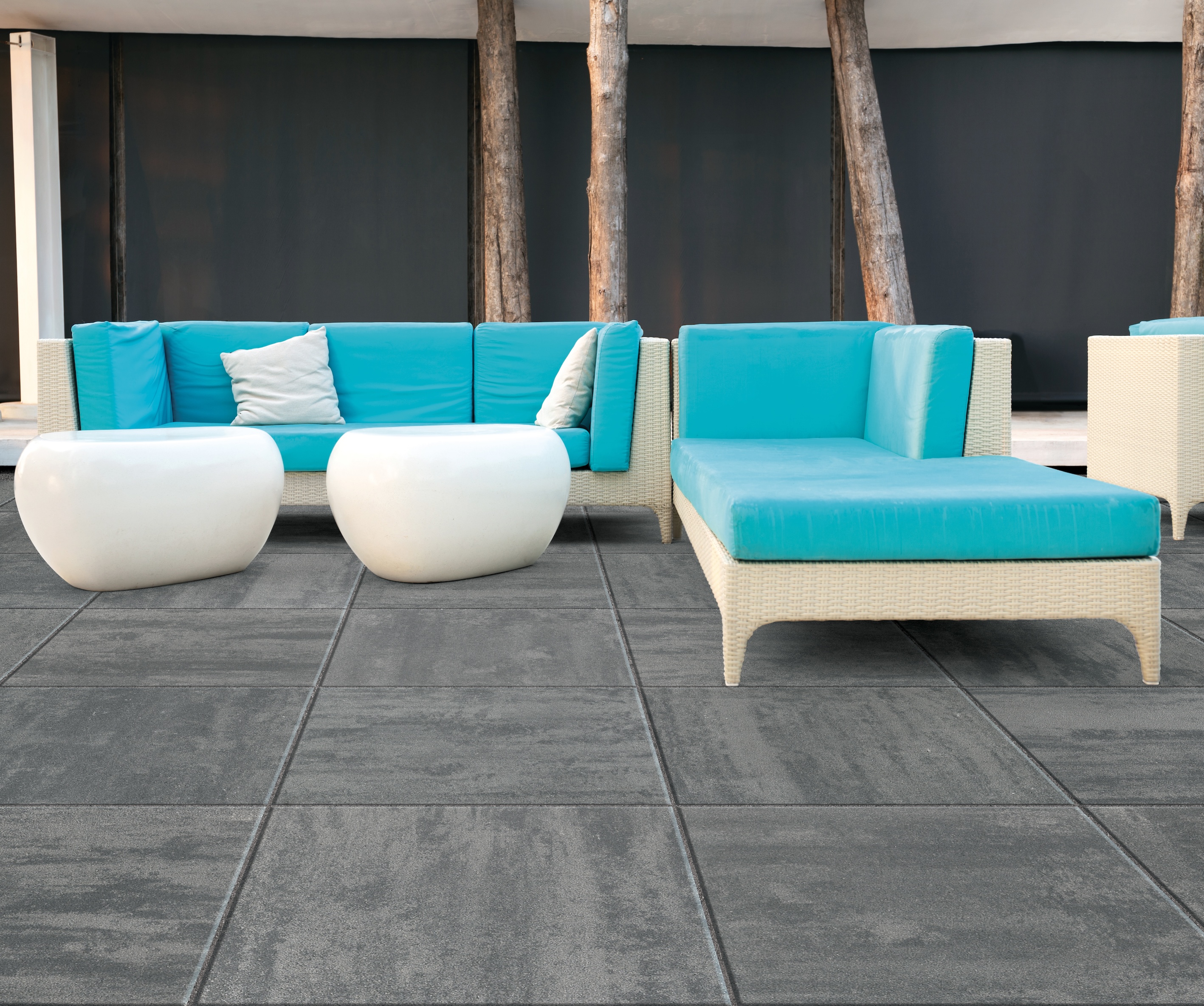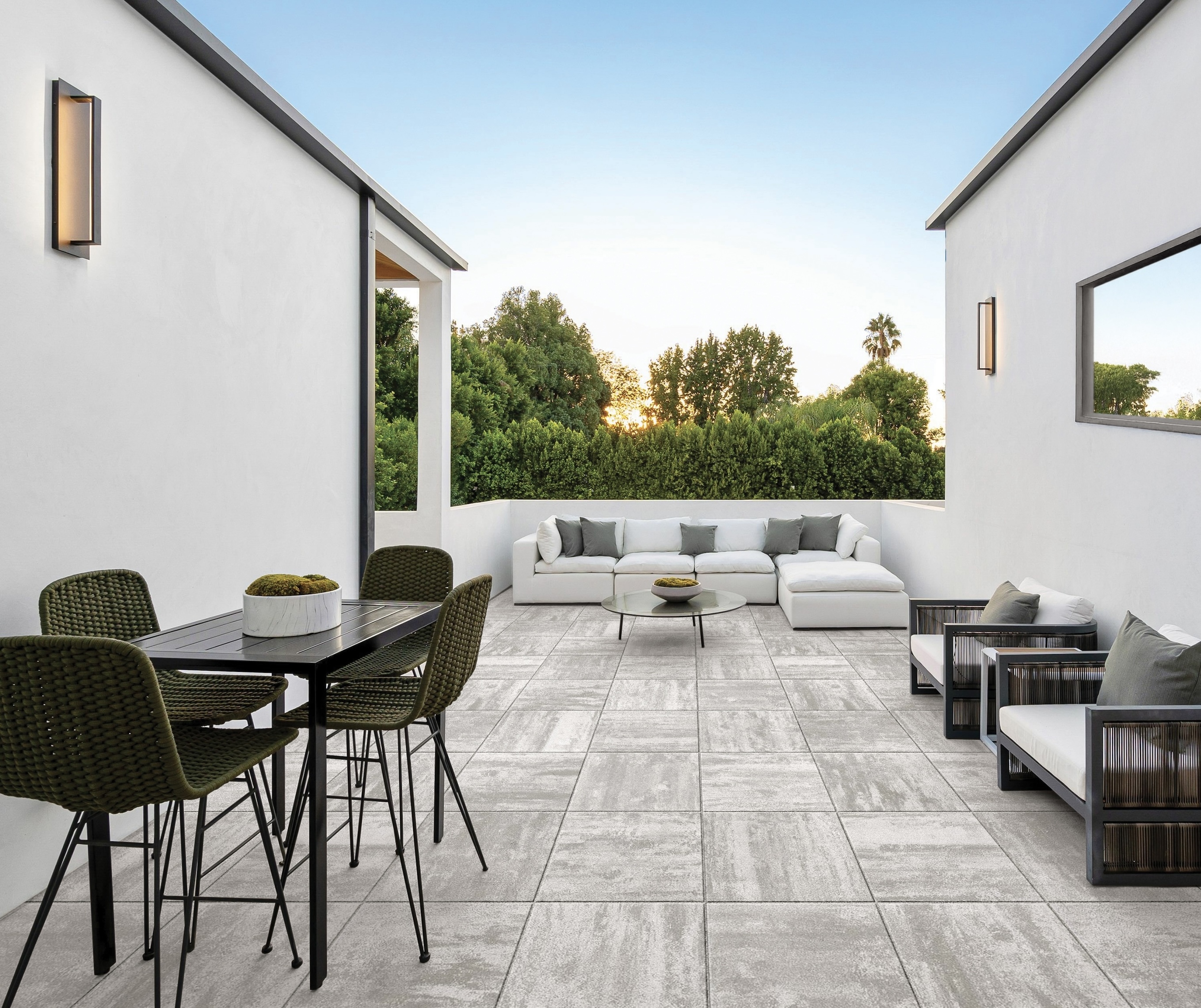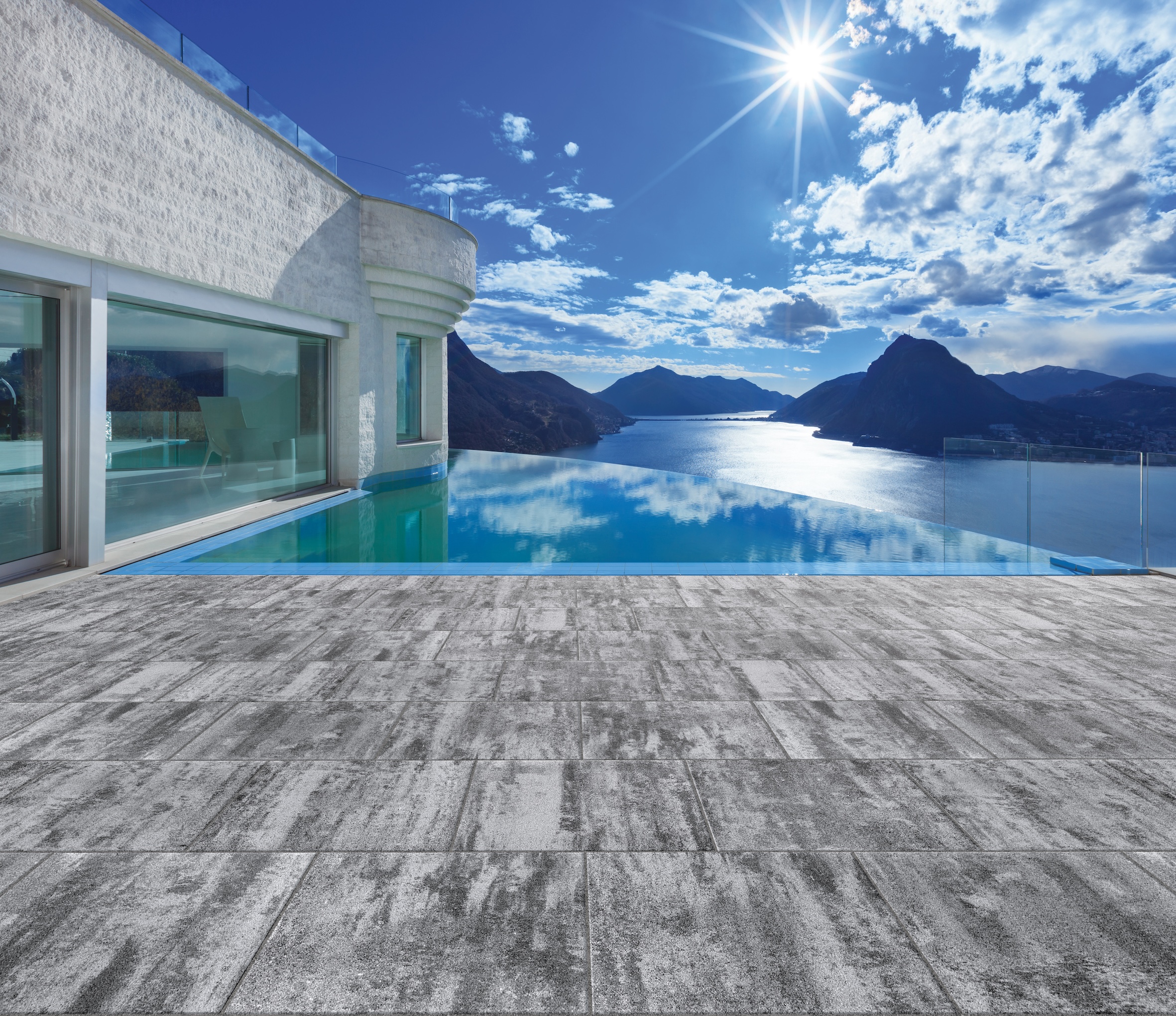 Lastra fiammata in pietra ricostruita. Il grande formato quadrato riesce, posato sia allineato che a correre, a ridefinire gli spazi perfezionandoli. Dona uno stile moderno e ricercato. Resistente ad abrasione, antigelo e scivolamento.
