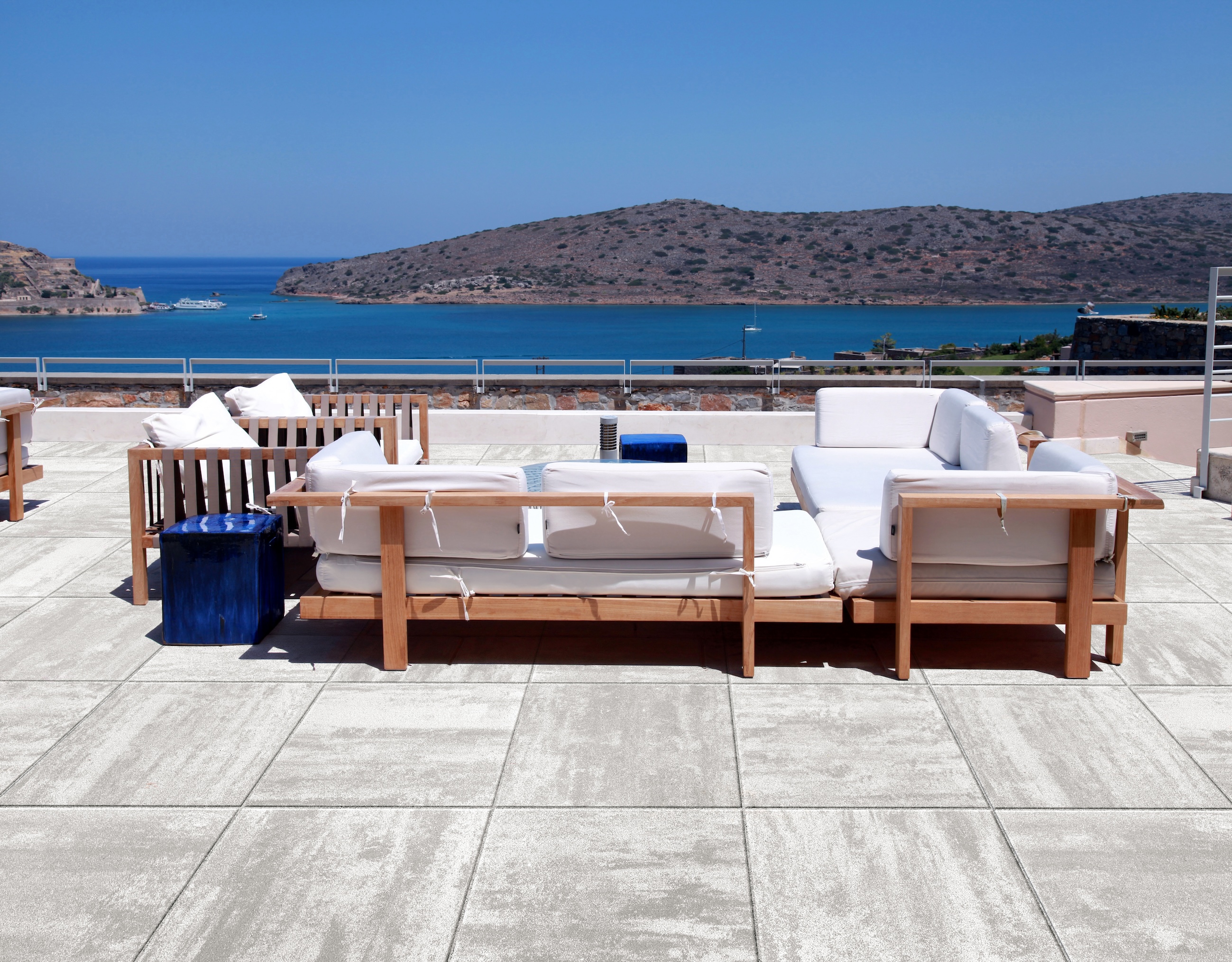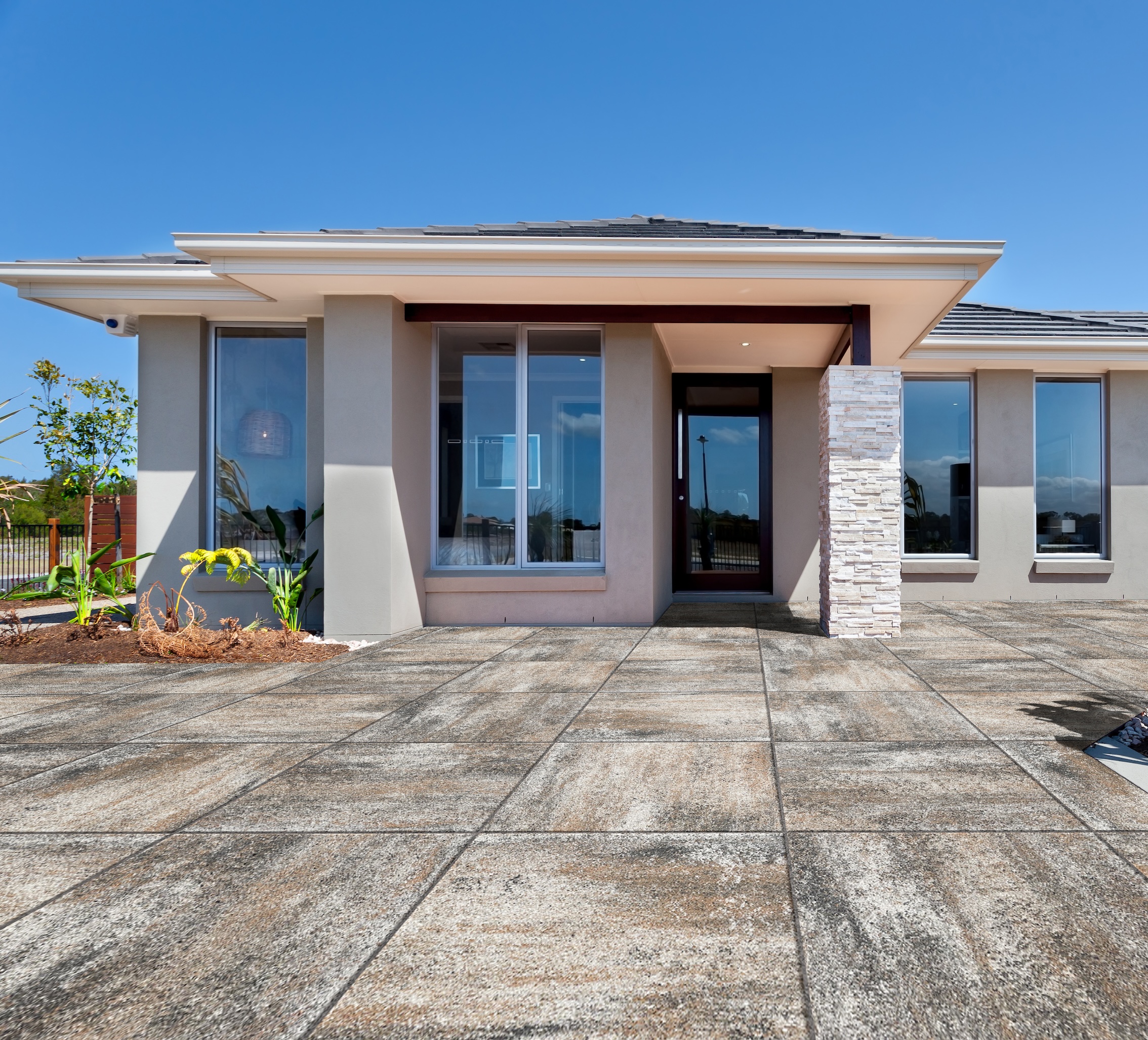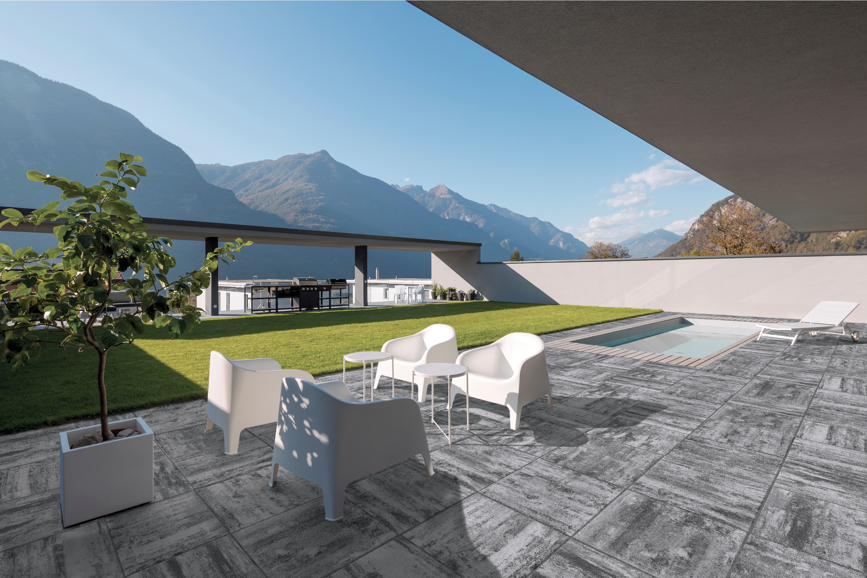 Lastra fiammata in pietra ricostruita. Il grande formato quadrato riesce, posato sia allineato che a correre, a ridefinire gli spazi perfezionandoli. Dona uno stile moderno e ricercato. Resistente ad abrasione, antigelo e scivolamento.