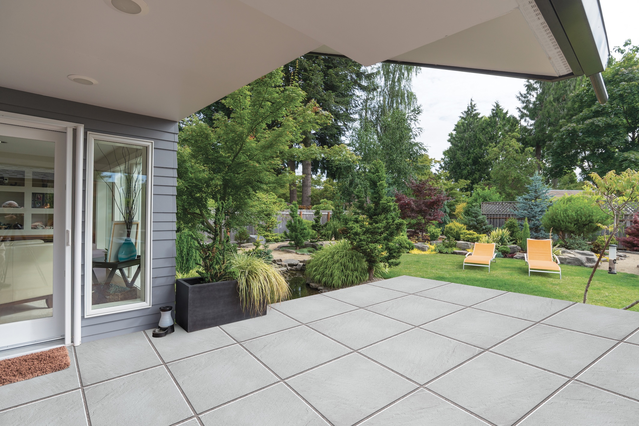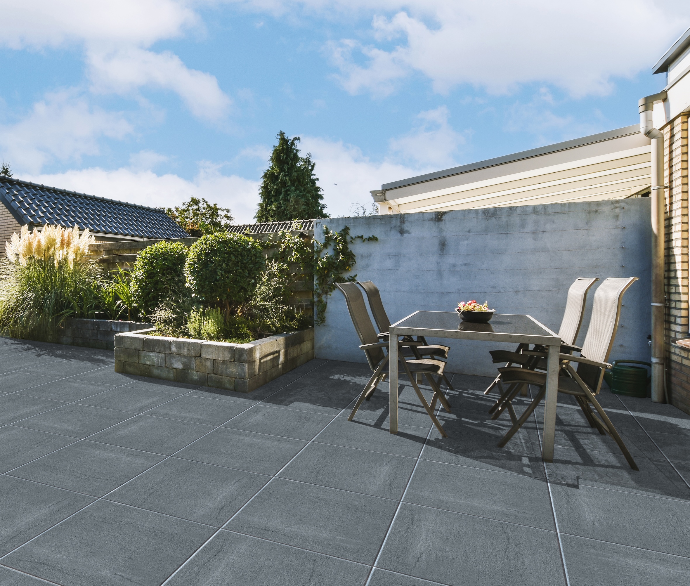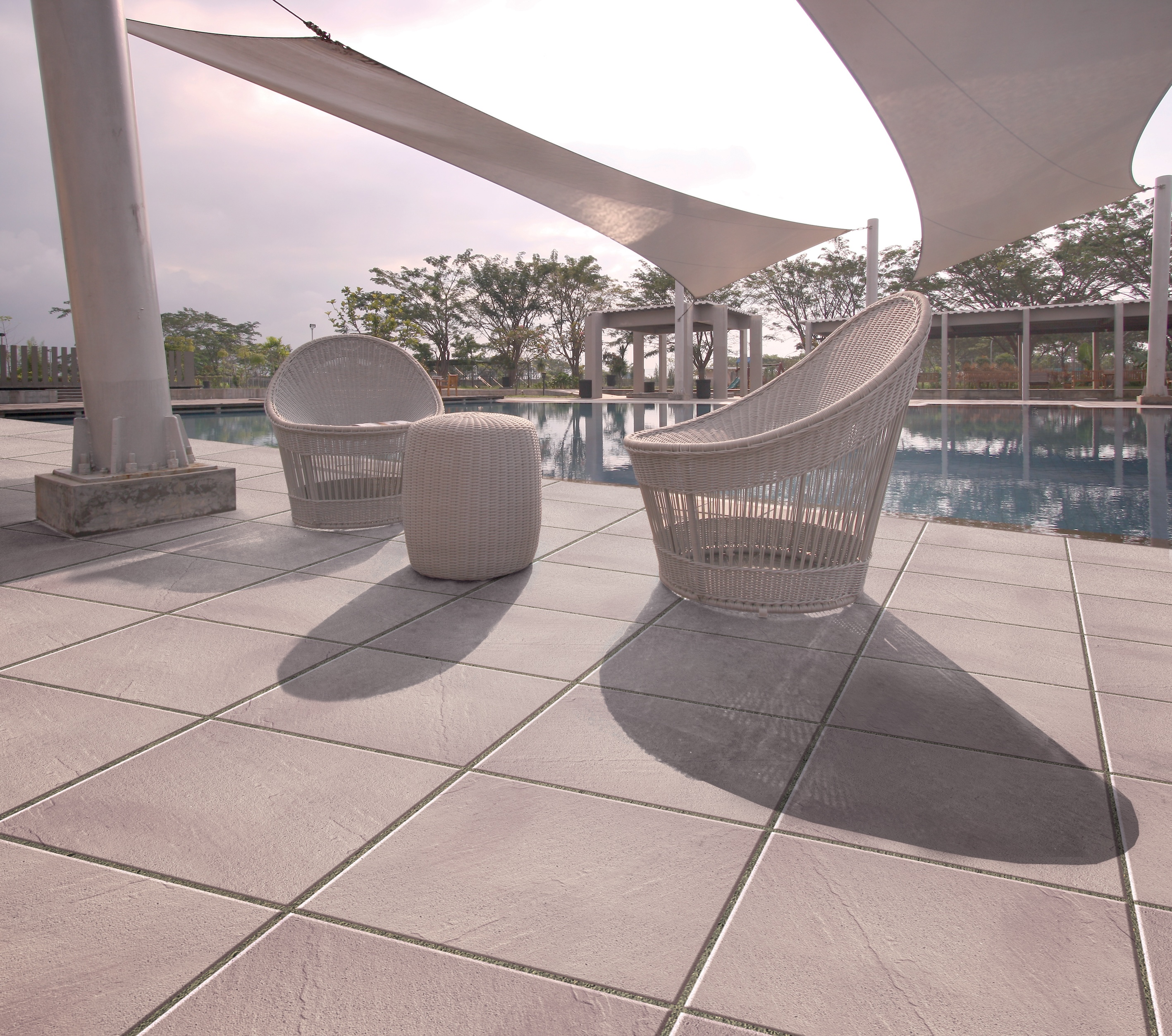 Superficie con un leggero effetto pietra a spacco, perfetta per verande e passaggi pedonali, la gamma colori consente interessanti giochi cromatici, resistente allo sporco.