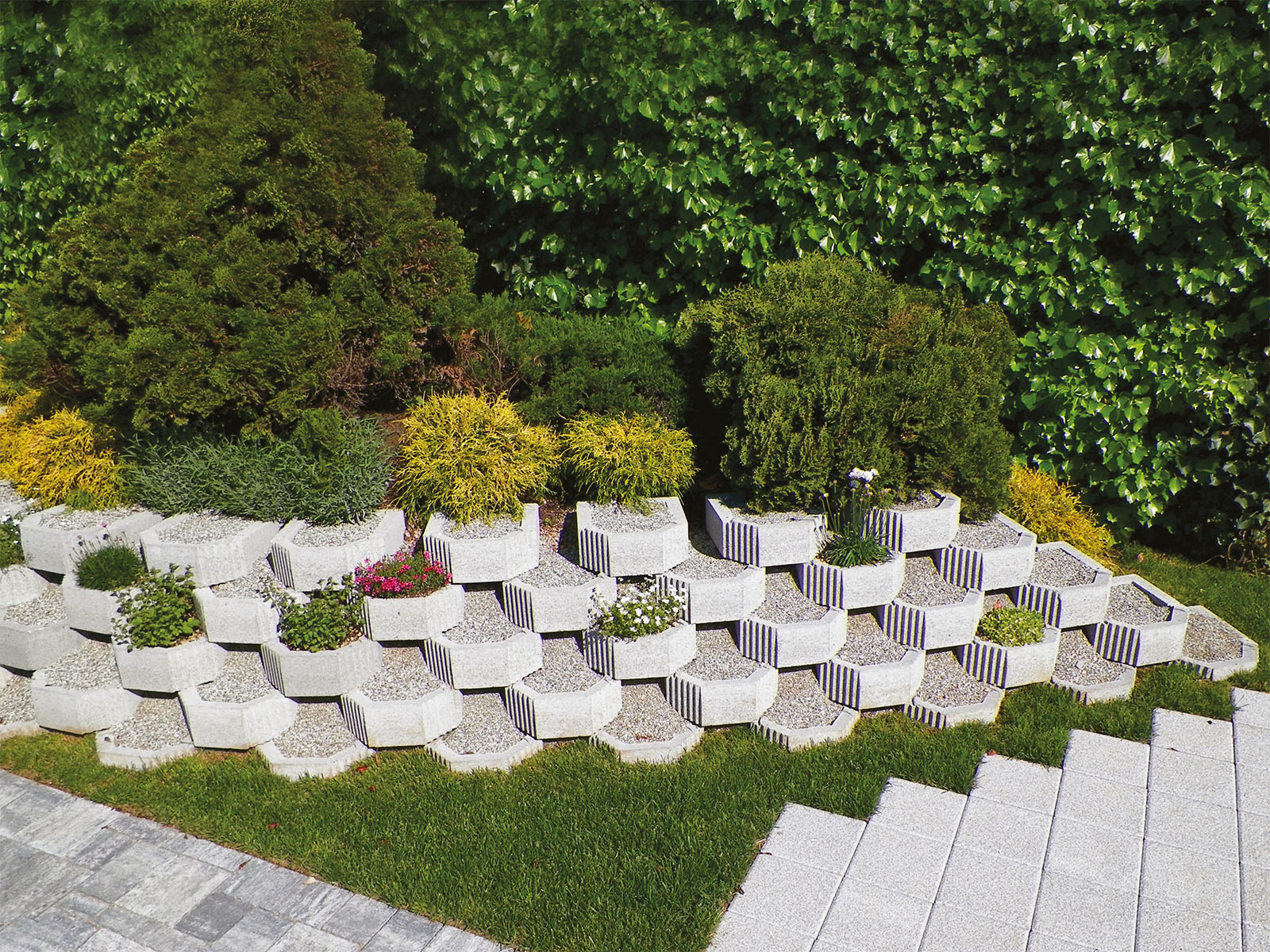 MURO FACILE di MVB è un muro a secco per la realizzazione di murature di contenimento e di mantenimento di scarpate. È costituito da un unico elemento cavo, molto leggero. Il basso peso ne agevola la posa, riducendo i tempi di assemblaggio. Grazie alla sua particolare geometria è il blocco ideale per la messa a dimora di svariate specie floreali, con la possibilità di creare curve e controcurve per un effetto finale sorprendentemente mosso e articolato.