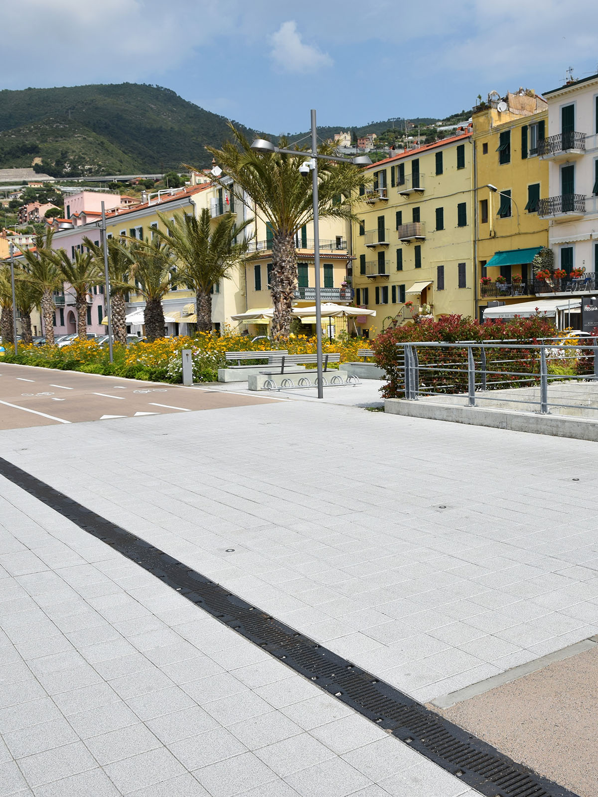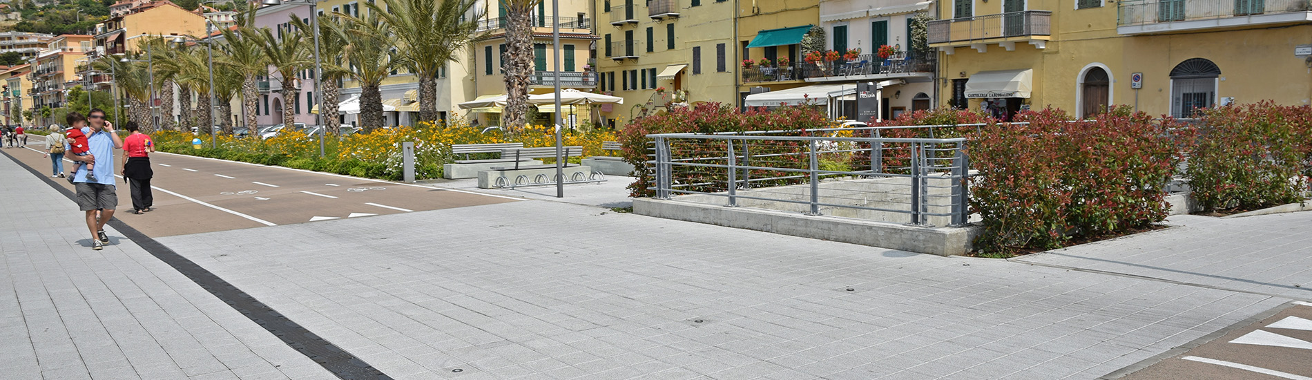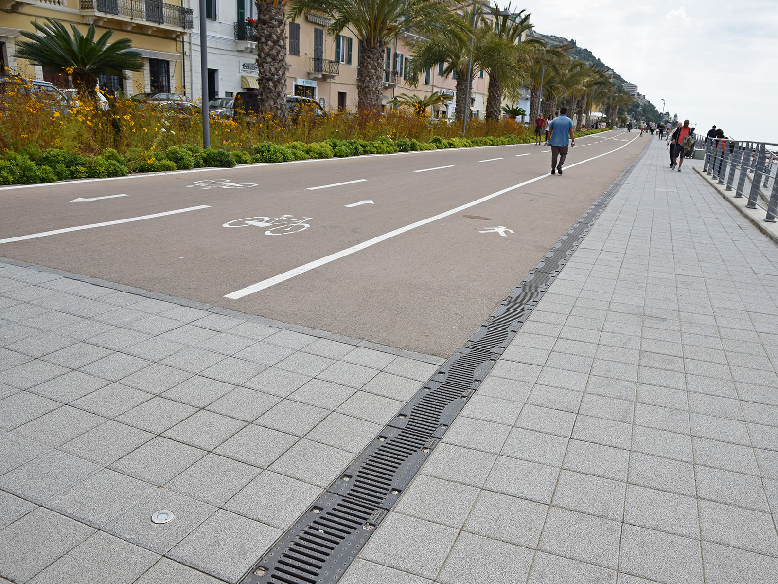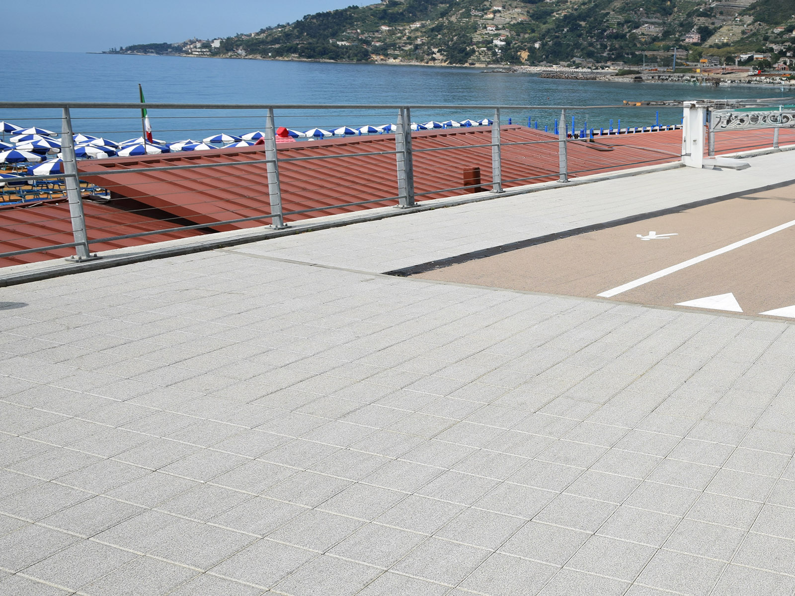 A Ospedaletti (IM), sulla Riviera Ligure di Ponente, mille metri quadri di pista ciclopedonale sono stati realizzati utilizzando il massello QUADRO firmato MVB, impiegato in particolare nelle aree di sosta, negli attraversamenti pedonali e in tutta la passeggiata a mare: una scelta di qualità per un grande progetto di rilancio turistico.