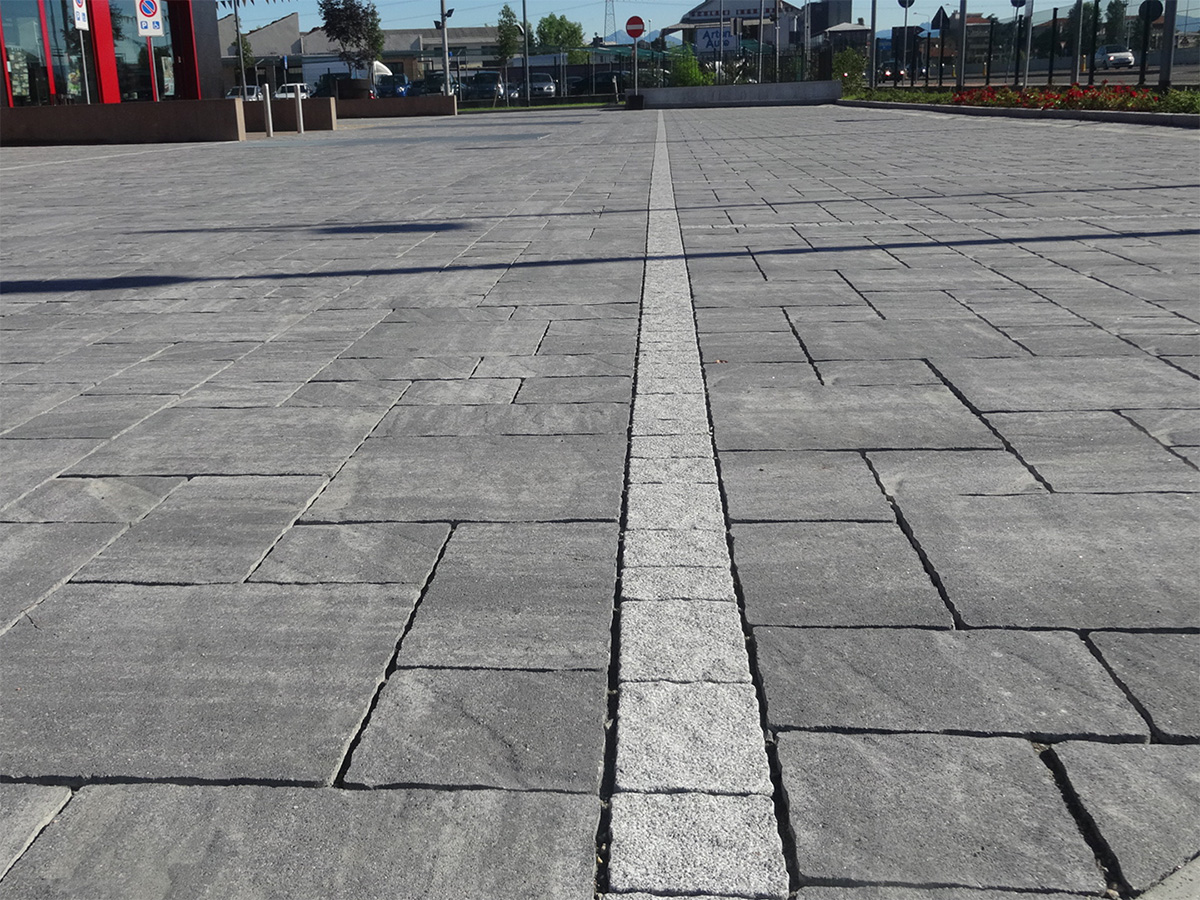 Per segnare i posti auto sono stati utilizzati masselli di dimensione più ridotta, RUSTIC® dalla colorazione chiara, in contrasto. Per la delimitazione delle aiuole sono invece stati utilizzati i CORDOLI PIETRA con Finitura Granito.