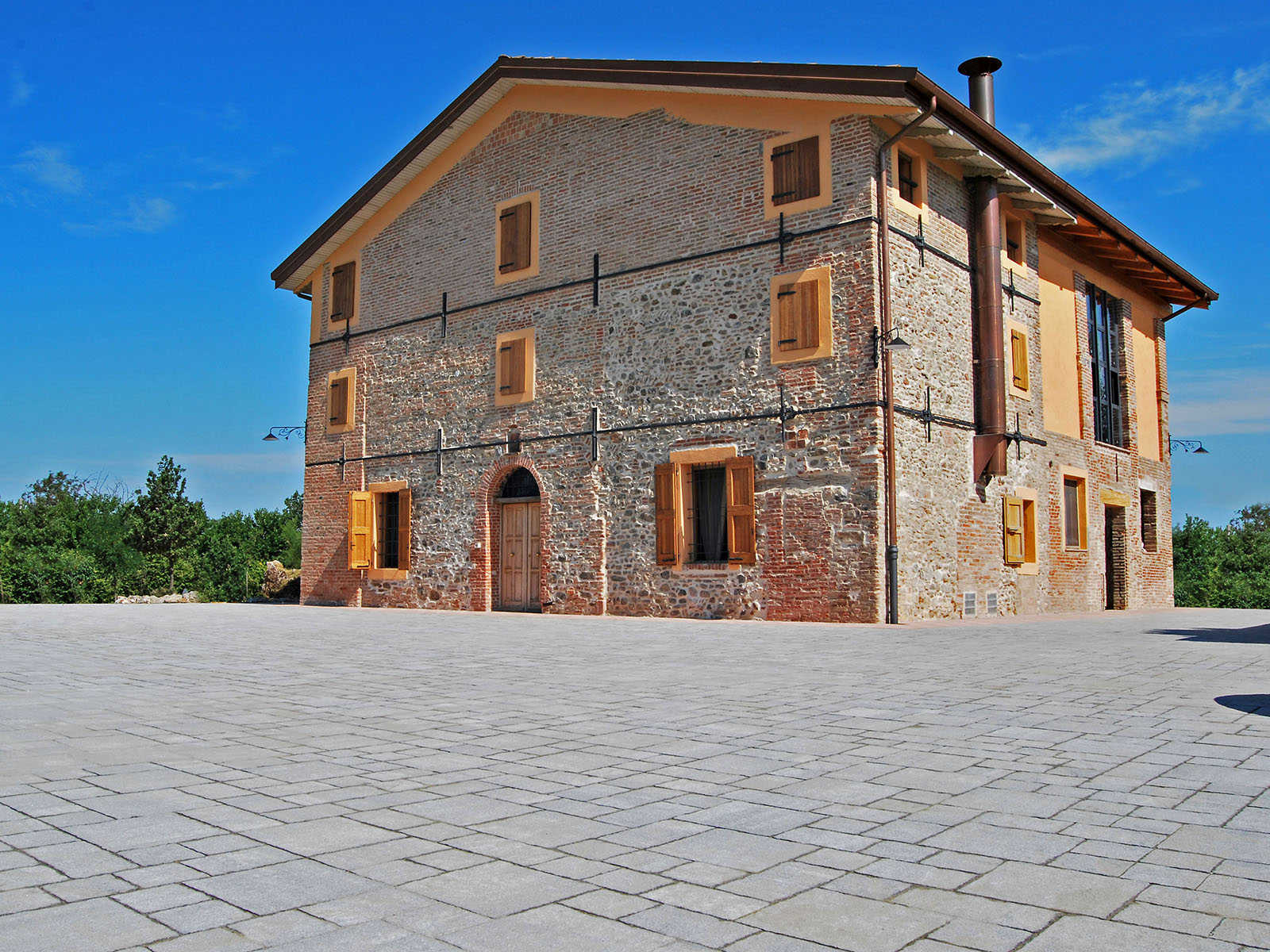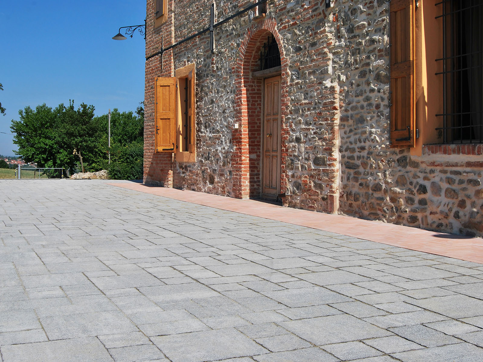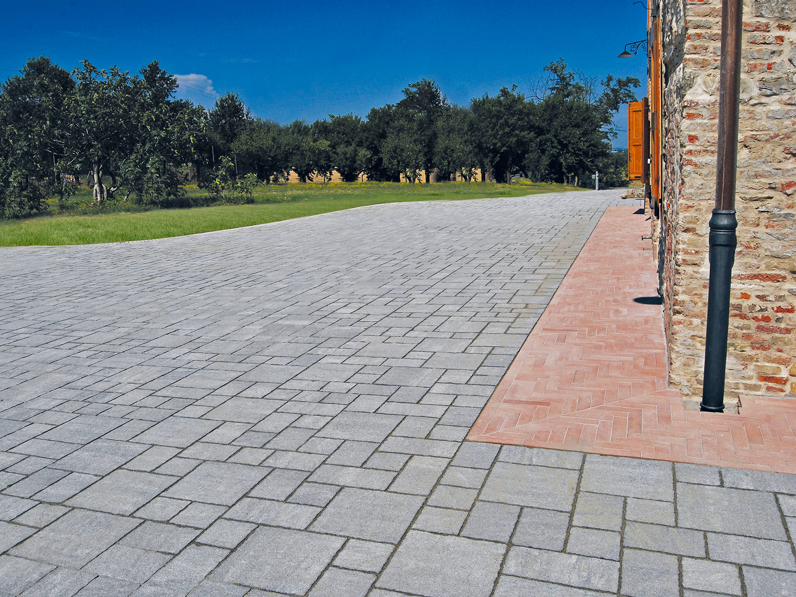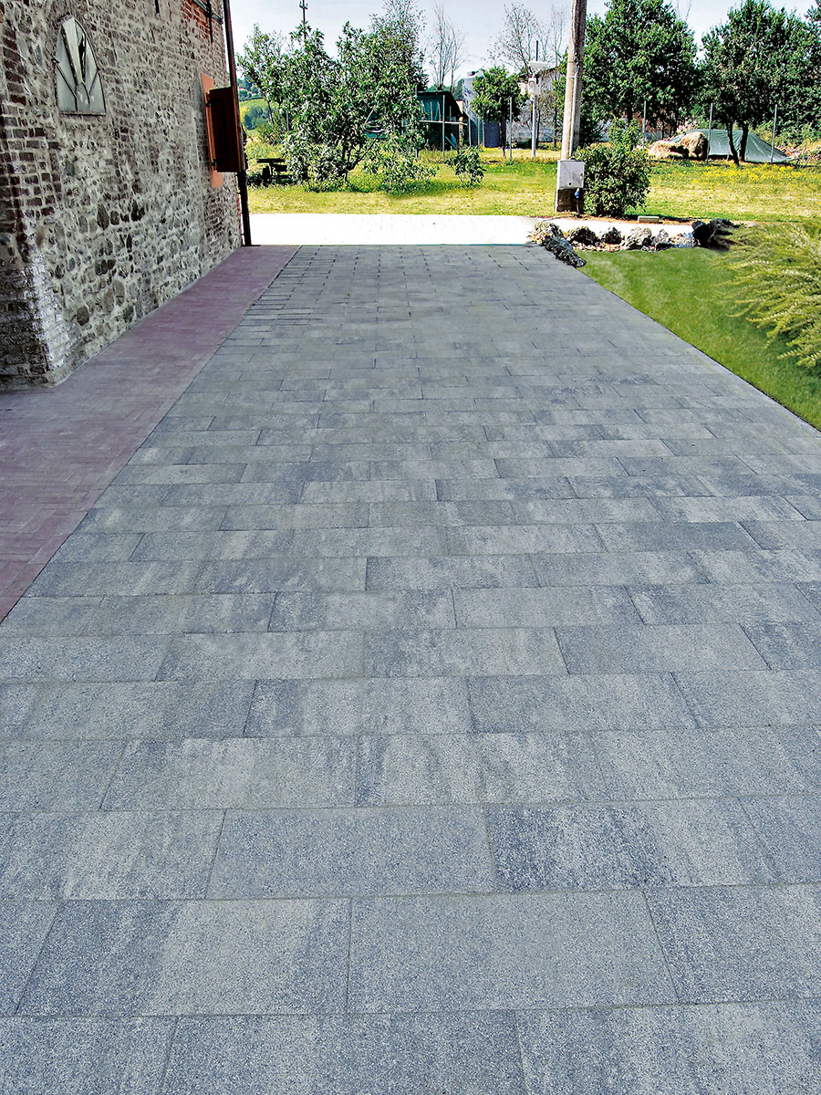 Sulle pendici delle colline bolognesi, una splendida casa colonica padronale del 1600 è stata riqualificata utilizzando, per la pavimentazione degli spazi esterni, i masselli autobloccanti ROMA e le Piastre 60×30 di MVB Bagattini.